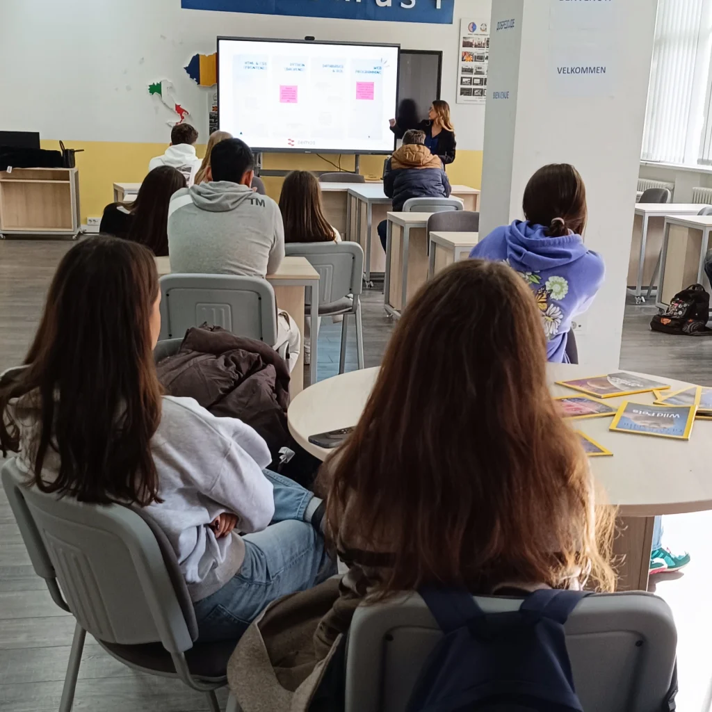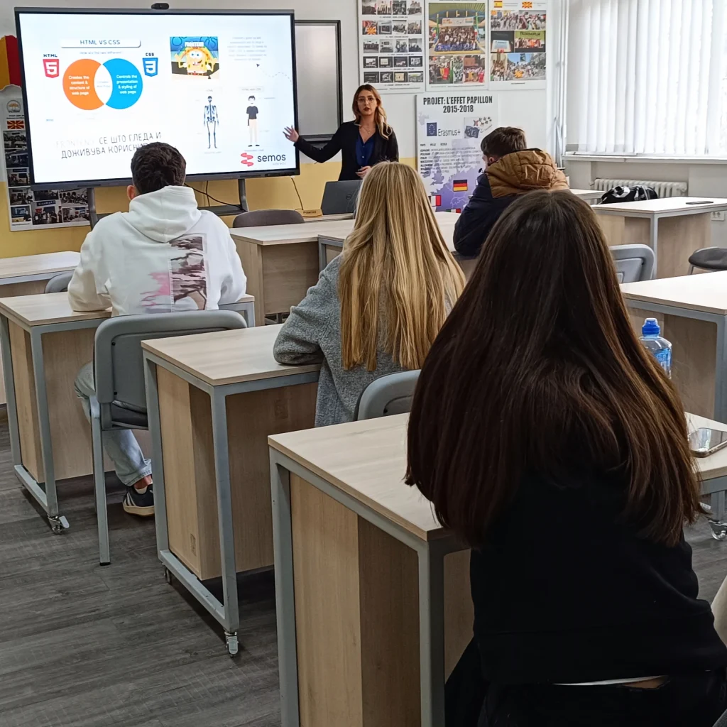 Презентацијата беше посветена на стручната програма „Python + AI – full stack mini academy “ наменета за средношколци, која им овозможува на младите да направат свои први чекори во светот на програмирањето и вештачката интелигенција. На двете смени на училиштето беа присутни повеќе од 100 ученици од сите четири години, кои со голем интерес ги следеа содржините и поставуваа прашања поврзани со примената на технологијата во различни индустрии.