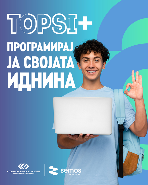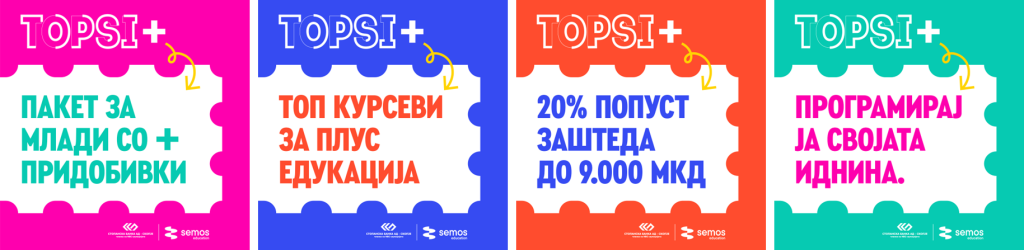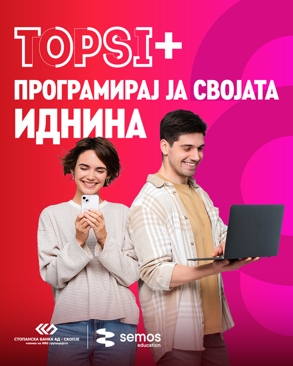Семос Eдукација, во соработка со Стопанска банка АД Скопје и преку младинскиот банкарски пакет ТОПСИ, овозможува 20% попуст на избрани курсеви и академии за сите корисници на ТОПСИ картички, со цел да се олесни пристапот до практични дигитални знаења и вештини.